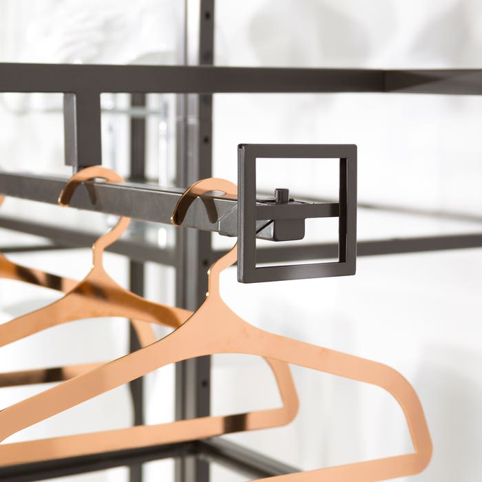 Linea 3-1/2″ x 3-1/2″ Sign holder fits over the end of any straight hang bar in the Linea Collection. Add a little “punch” with a graphic right at the garment level!