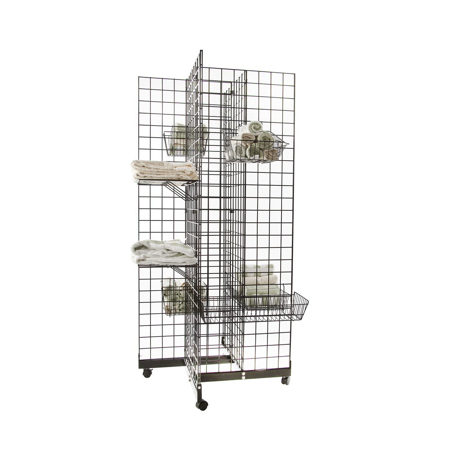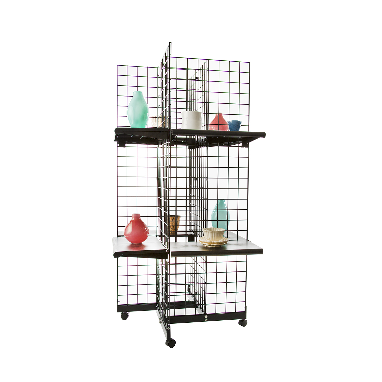 Base accepts four, 2′ wide grid panels to create a dynamic movable display. Used for shelves, hangrail brackets, face-outs and hooks, to create a wide variety of display possibilities.