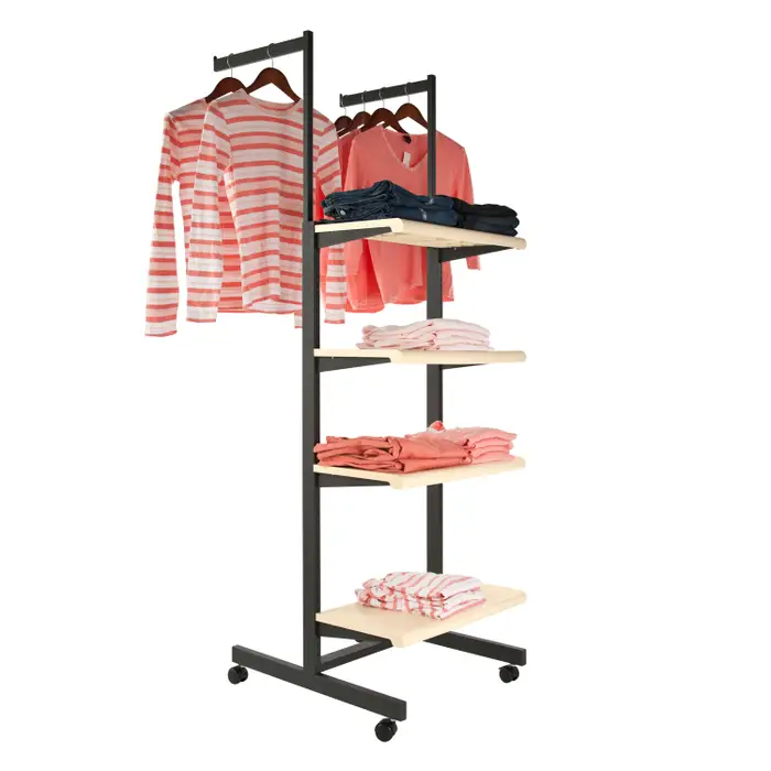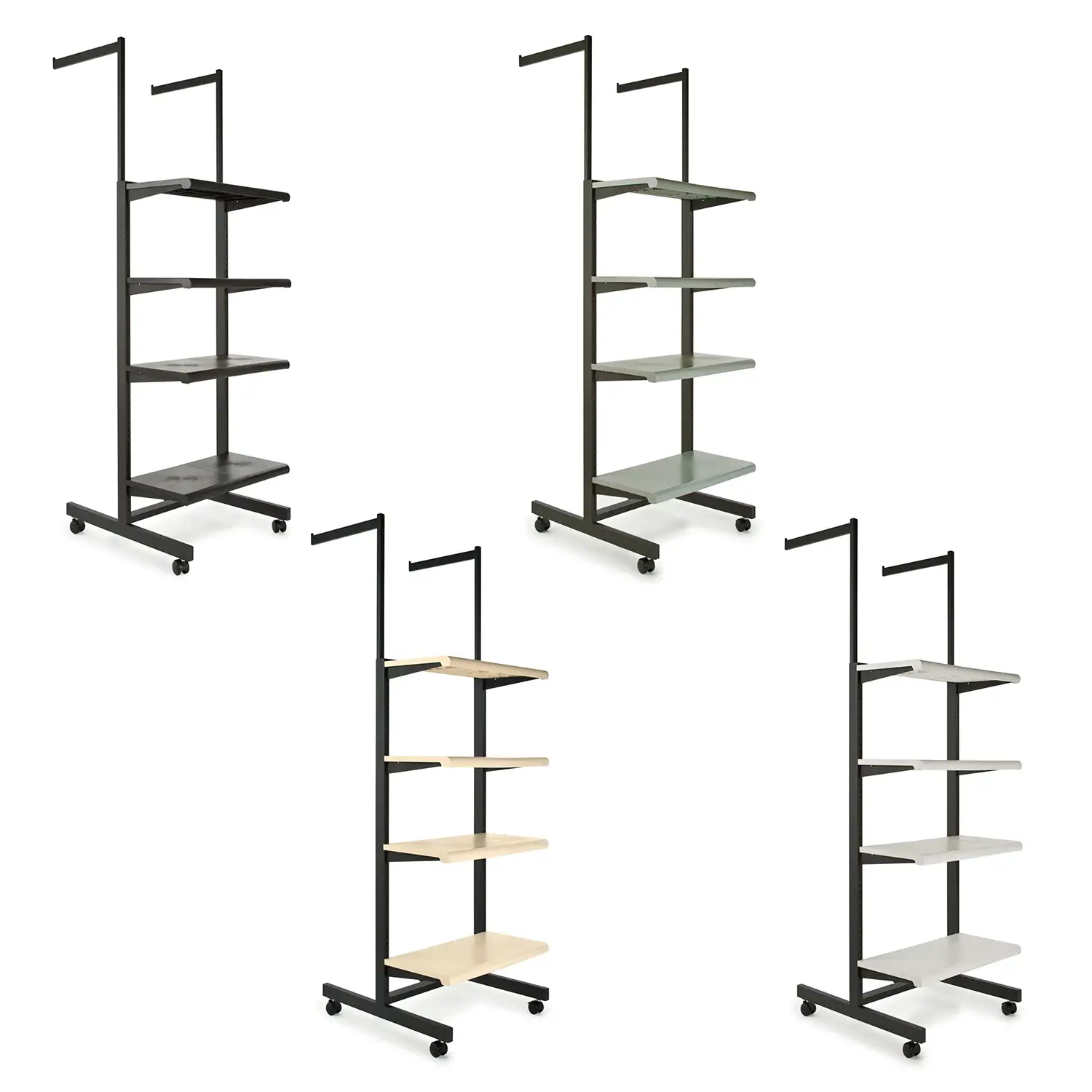 Experience more in-store cross-promotion options than ever with the Designer 400 Series of combination merchandisers! Showcase your best folded or hanging apparel where you get the most foot traffic for maximum sales. These units arrive complete with tubular frame, brackets, shelves, hangrails and casters (except 411K, where we don’t recommend casters). We also have great-looking duron shelves available in wood grain finish for an extra charge.