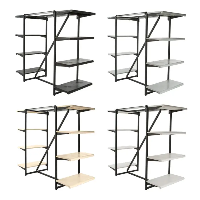 The Designer 400 Series of combination merchandisers offers the retailer the ability to cross-merchandise folded and hanging apparel. All units shown are available complete with tubular frame, brackets, shelves, and hangrails. Casters are not recommended. Duron shelves are also available in wood grain finishes at an extra charge.
