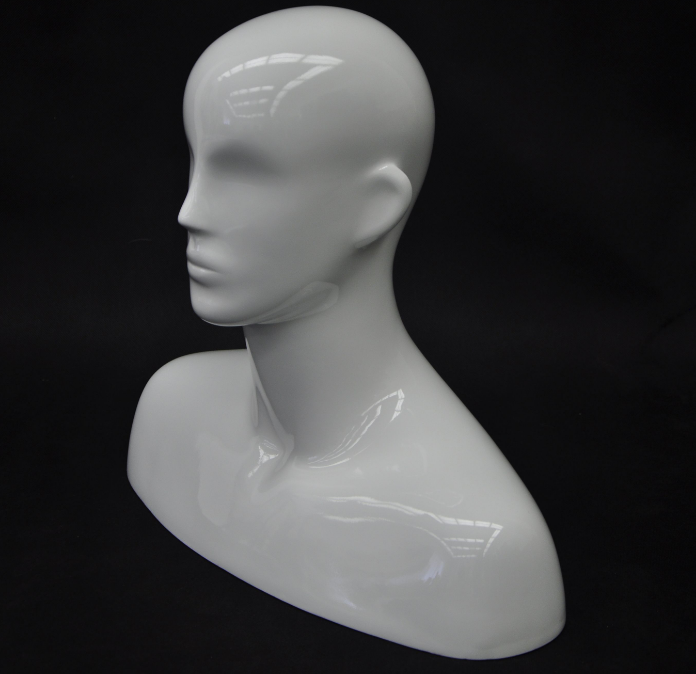 Male mannequin head, abstract style with round shoulder for table top display.