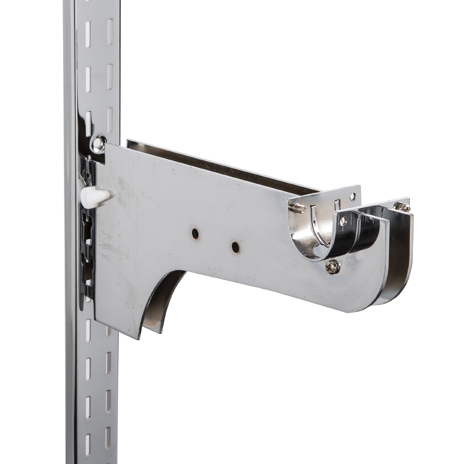 Heavy duty twin bracket with “U” cup for 1-1/4” or 1-5/16” round hangrail. Available sizes: 8”, 10”, 12”, 14” and 16” (fits 1/2” slot, 1” OC wall standards). Available finish: chrome.