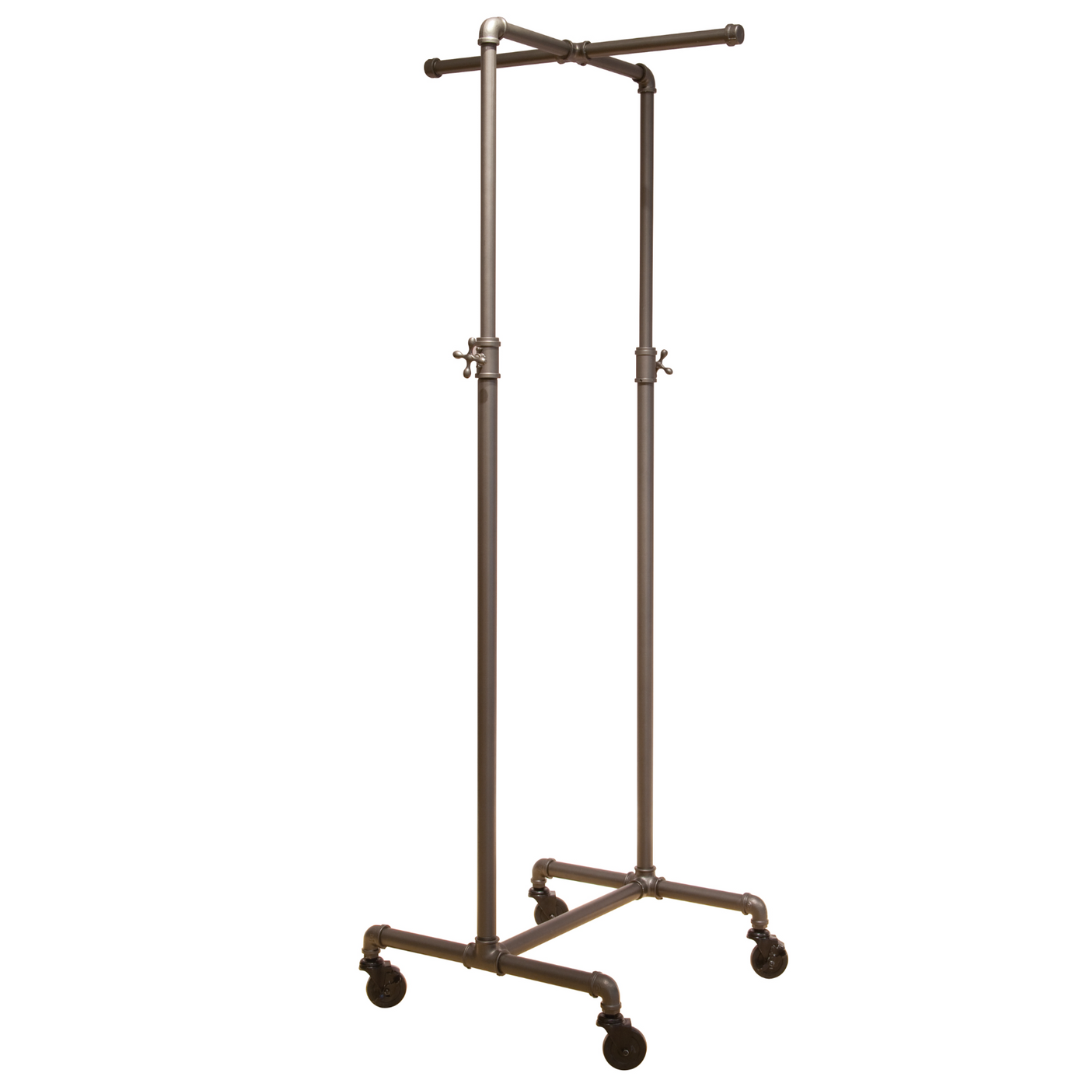 Adjusts from 44″ – 72″ in height. Base: 21″W x 21″D with 13″ Faceouts. Constructed of heavy duty 1 1/4″ diameter plumbing pipe in anthracite grey finish. Includes four 3″ casters, 2 locking, 2 non-locking.