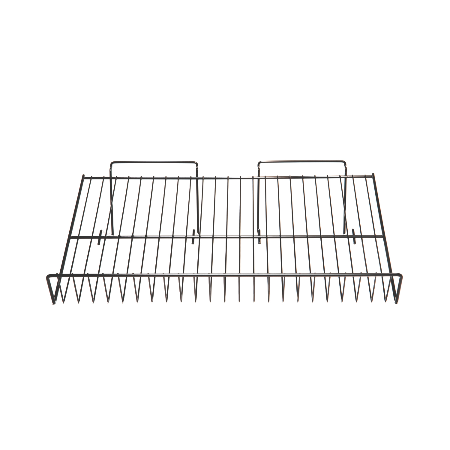 Slant shelf of 1/4” wire. 15”W x 24” L with 3” lip. Available finish: black,white and chrome